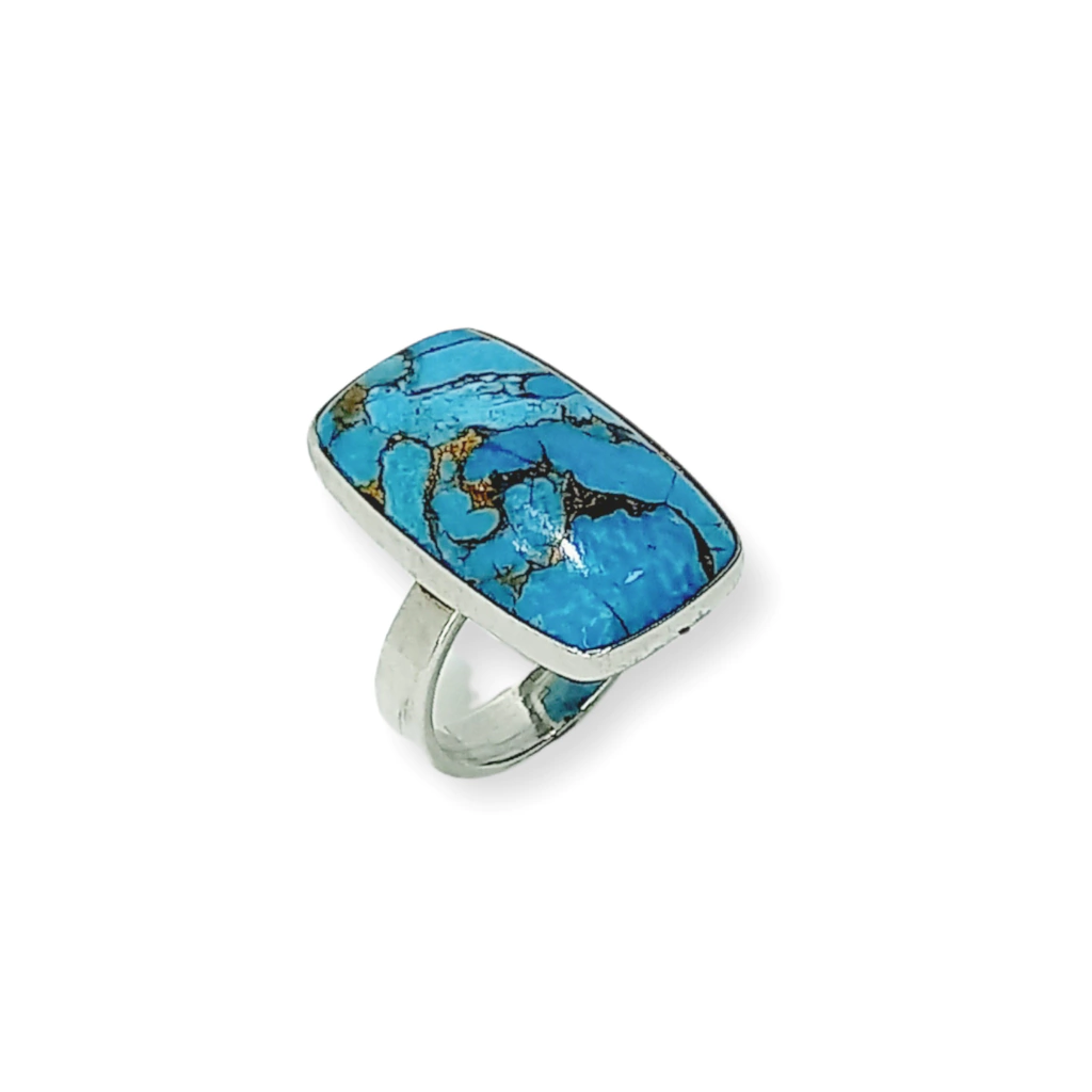 El diseño rectangular del anillo resalta la belleza de la piedra Larimar, creando una armonía perfecta entre el metal y la gema. Este contraste no solo lo convierte en un accesorio llamativo, sino que también simboliza la paz y la tranquilidad, características asociadas a esta piedra.