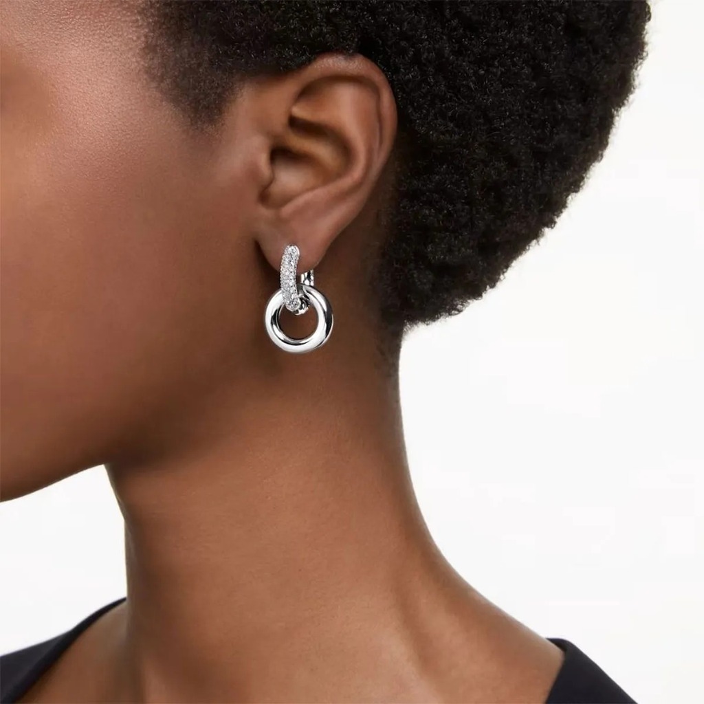 Estos pendientes de aro entrelazados Dextera de Swarovski combinan dos aros tubulares con un elegante baño de rodio, uno de los cuales está adornado con pavé. Su diseño asimétrico destaca por la disposición distinta de los aros en cada pendiente. Además, ofrecen versatilidad al permitir separar el segundo aro, transformándolos en un estilo de aro individual.